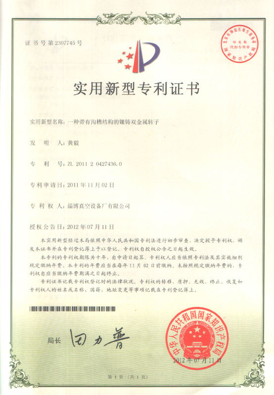 “一種帶有溝槽結(jié)構(gòu)的鑲鑄雙金屬轉(zhuǎn)子”獲實用新型專利證書