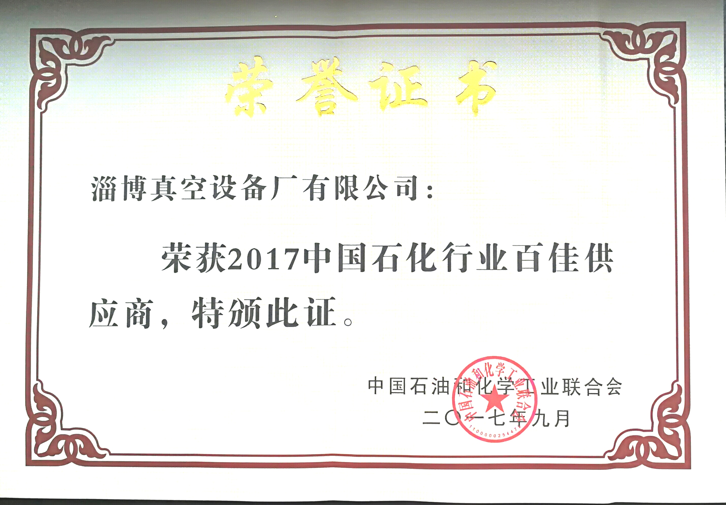 中國石油和化工行業(yè)百佳供應(yīng)商證書